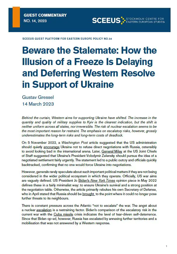 Behind the curtain, Western aims for supporting Ukraine have shifted. The increase in the quantity and quality of military supplies to Kyiv is the clearest indication, but the shift is neither uniform across all states, nor irreversible. The risk of nuclear escalation seems to be the most important reason for restraint. The emphasis on escalatory risks, however, grossly underestimates the long-term risks and long-term costs of deadlock.