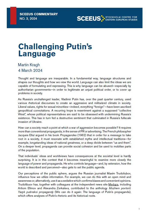 Our perceptions of the public sphere, argues the Russian journalist Maxim Trudoliubov, influence how we utilize information. For example, we can do this with an open mind and awareness or, alternatively, use it as a sedative which confirms biases and convenient opinions. Trudolibuov has, together with colleagues at the independent news site Meduza, including Artiom Efimov and Alexandra Zerkaleva, contributed to the anthology Mozhem povtorit: Yazyk putinskoi propagandy (We can do it again: The language of Putin’s propaganda), which offers analyses of Putin’s rhetoric and its historical roots.