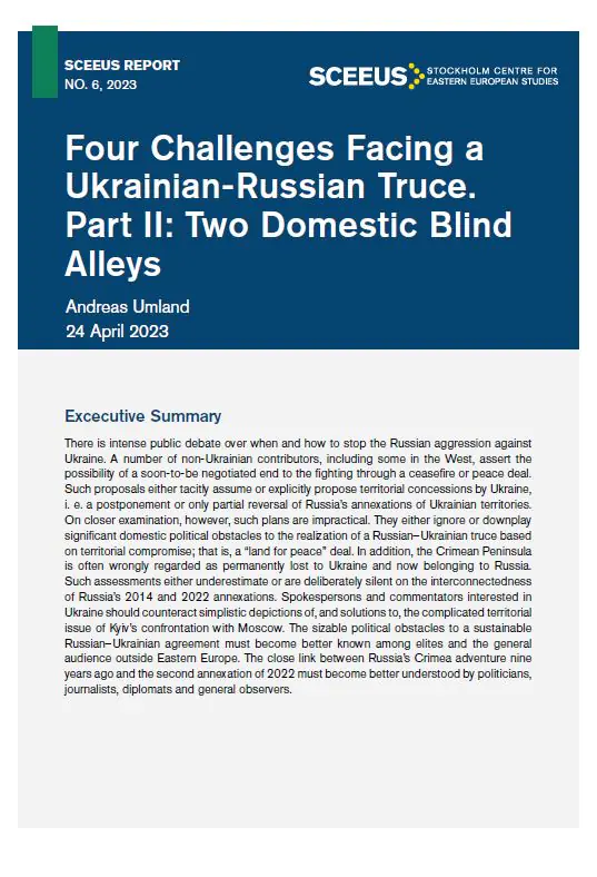[2] Andreas Umland, “Four Challenges Facing a Ukrainian-Russian Truce. Part I: The Constitutional Impasse,” SCEEUS Report, no. 2, 2023. https://sceeus.se/en/publications/four-challenges-facing-a-ukrainian-russian-truce-part-i-the-constitutional-impasse/.