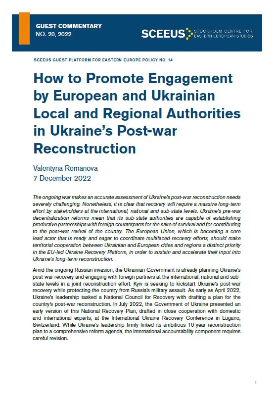 The second spillover effect will be to sustain Ukraine’s decentralization framework. A distinct priority area of territorial cooperation within the EU-led platform would accustom Ukraine’s local and regional authorities to operate according to the principles of subsidiarity and accountability. The EU and its member states, notably Sweden, had been supporting Ukraine’s decentralization before the outbreak of Russia’s war and will continue to provide policy advice and funding to sustain the reform. Long-term partnerships between cities and regions in the EU, where regional and local authorities are strong, and in Ukraine, would help to sustain Ukraine’s decentralization policy for the benefit of effective implementation of Ukraine’s recovery plan.