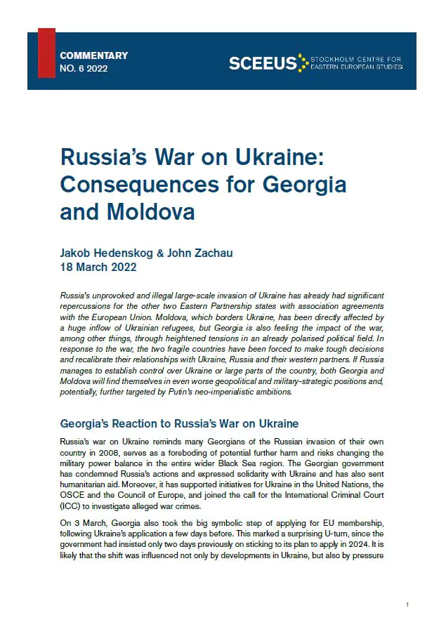 Russia’s unprovoked and illegal large-scale invasion of Ukraine has already had significant repercussions for the other two Eastern Partnership states with association agreements with the European Union. Moldova, which borders Ukraine, has been directly affected by a huge inflow of Ukrainian refugees, but Georgia is also feeling the impact of the war, among other things, through heightened tensions in an already polarised political field. In response to the war, the two fragile countries have been forced to make tough decisions and recalibrate their relationships with Ukraine, Russia and their western partners. If Russia manages to establish control over Ukraine or large parts of the country, both Georgia and Moldova will find themselves in even worse geopolitical and military-strategic positions and, potentially, further targeted by Putin’s neo-imperialistic ambitions.