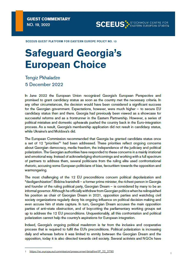 In June 2022 the European Union recognized Georgia’s European Perspective and promised to grant candidacy status as soon as the country met the necessary criteria. In any other circumstances, the decision would have been considered a significant success for the Georgian government. Expectations, however, were much higher – to secure EU candidacy status then and there. Georgia had previously been viewed as a showcase for successful reforms and as a frontrunner in the Eastern Partnership. However, a series of political mistakes and domestic upheavals pushed the country back in the Euro-integration process. As a result, Georgia’s membership application did not result in candidacy status, while Ukraine’s and Moldova’s did.