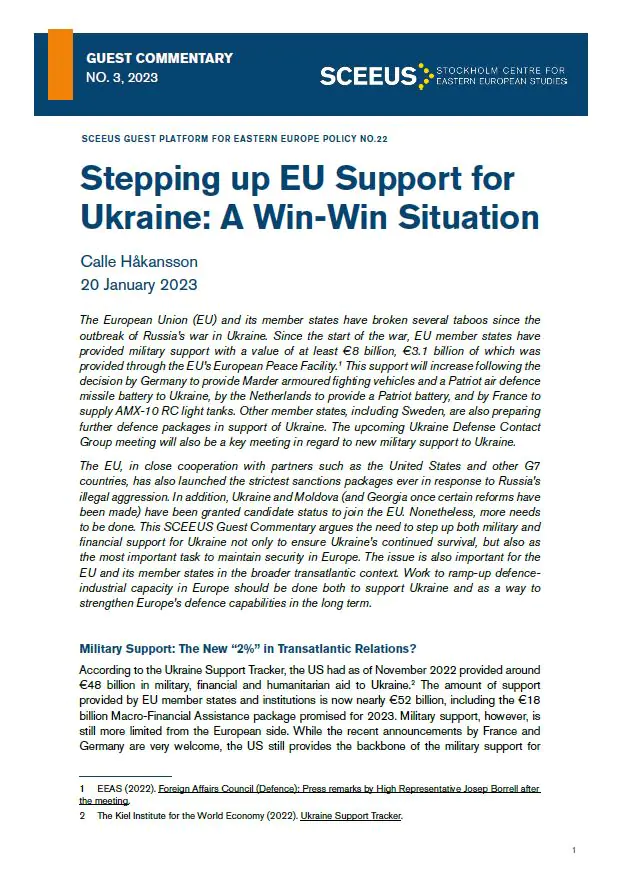 The EU, in close cooperation with partners such as the United States and other G7 countries, has also launched the strictest sanctions packages ever in response to Russia’s illegal aggression. In addition, Ukraine and Moldova (and Georgia once certain reforms have been made) have been granted candidate status to join the EU. Nonetheless, more needs to be done. This SCEEUS Guest Commentary argues the need to step up both military and financial support for Ukraine not only to ensure Ukraine’s continued survival, but also as the most important task to maintain security in Europe. The issue is also important for the EU and its member states in the broader transatlantic context. Work to ramp-up defence-industrial capacity in Europe should be done both to support Ukraine and as a way to strengthen Europe’s defence capabilities in the long term.