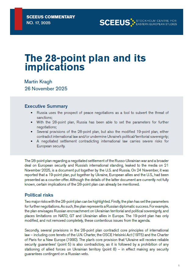 The 28-point plan regarding a negotiated settlement of the Russo-Ukrainian war and a broader deal on European security and Russia’s international standing, leaked to the media on 21 November 2025, is a document put together by the U.S. and Russia. On 24 November, it was reported that a 19-point plan, put together by Ukraine, European allies and the U.S., had been presented as a counter-offer. Although the details of the latter document are currently not fully known, certain implications of the 28-point plan can already be mentioned.
