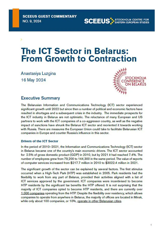 The Belarusian Information and Communications Technology (ICT) sector experienced significant growth until 2022 but since then a number of political and economic factors have resulted in shortages and a subsequent crisis in the industry. The immediate prospects for the ICT industry in Belarus are not optimistic. The reluctance of many European and US partners to work with the ICT companies of a co-aggressor country, as well as the negative impact of sanctions have shrunk the Belarus ICT sector and reoriented it towards working with Russia. There are measures the European Union could take to facilitate Belarusian ICT companies in Europe and counter Russia’s influence in this sector.
