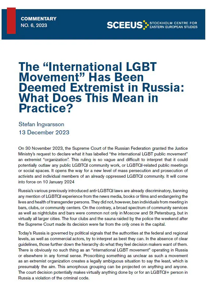 Today's Russia is governed by political signals that the authorities at the federal and regional levels, as well as commercial actors, try to interpret as best they can. In the absence of clear guidelines, those further down the hierarchy do what they feel decision makers want of them. There is obviously no such thing as an “international LGBT movement” operating in Russia or elsewhere in any formal sense. Proscribing something as unclear as such a movement as an extremist organization creates a legally ambiguous situation to say the least, which is presumably the aim. This amorphous grouping can be projected on anything and anyone. The court decision potentially makes virtually anything done by or for an LGBTQI+ person in Russia a violation of the criminal code.