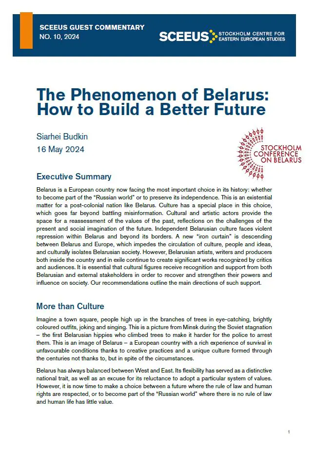 Belarus is a European country now facing the most important choice in its history: whether to become part of the “Russian world” or to preserve its independence. This is an existential matter for a post-colonial nation like Belarus. Culture has a special place in this choice, which goes far beyond battling misinformation. Cultural and artistic actors provide the space for a reassessment of the values of the past, reflections on the challenges of the present and social imagination of the future. Independent Belarusian culture faces violent repression within Belarus and beyond its borders. A new “iron curtain” is descending between Belarus and Europe, which impedes the circulation of culture, people and ideas, and culturally isolates Belarusian society. However, Belarusian artists, writers and producers both inside the country and in exile continue to create significant works recognized by critics and audiences. It is essential that cultural figures receive recognition and support from both Belarusian and external stakeholders in order to recover and strengthen their powers and influence on society. Our recommendations outline the main directions of such support.