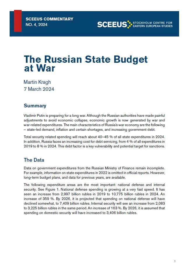 Total security related spending will reach about 40–45 % of all state expenditures in 2024. In addition, Russia faces an increasing cost for debt servicing, from 4 % of all expenditures in 2019 to 8 % in 2024. This debt factor is a key vulnerability and potential target for sanctions.