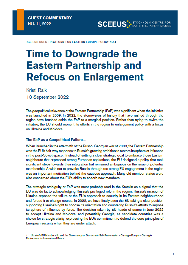 The geopolitical relevance of the Eastern Partnership (EaP) was significant when the initiative was launched in 2009. In 2022, the stormwaves of history that have rushed through the region have brushed aside the EaP to a marginal position. Rather than trying to revive the initiative, the EU should reorient its efforts in the region to enlargement policy with a focus on Ukraine and Moldova.