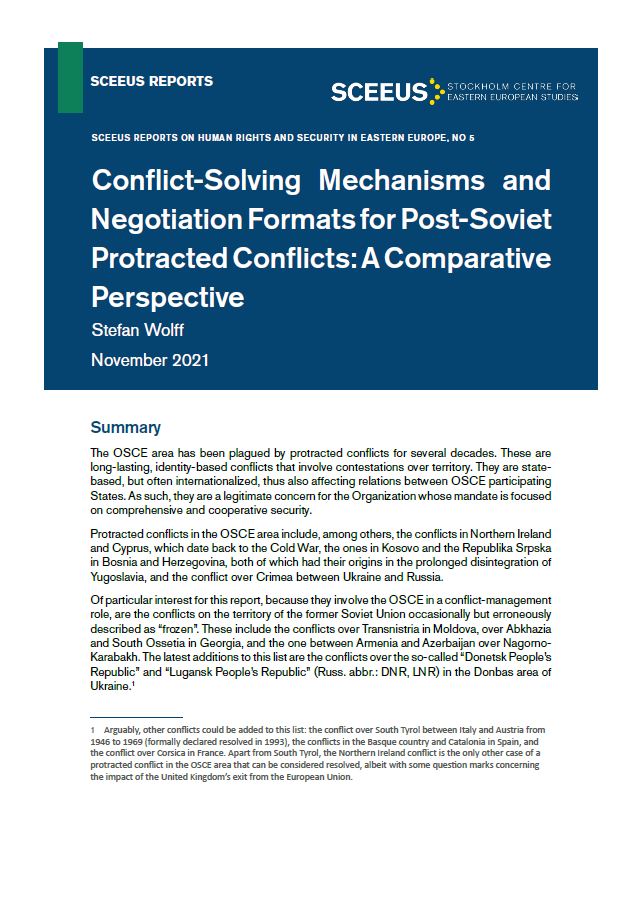The OSCE area has been plagued by protracted conflicts for several decades. These are long-lasting, identity-based conflicts that involve contestations over territory. They are state-based but often internationalised, and thus also affect relations between OSCE participating states. As such they are a legitimate concern for the OSCE, which has a focus on comprehensive and cooperative security.