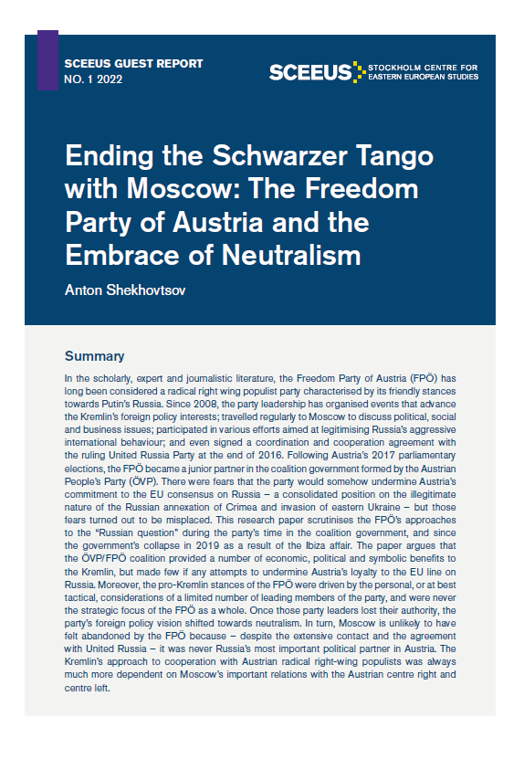 In the scholarly, expert and journalistic literature, the Freedom Party of Austria (FPÖ) has long been considered a radical right wing populist party characterised by its friendly stances towards Putin’s Russia. Since 2008, the party leadership has organised events that advance the Kremlin’s foreign policy interests; travelled regularly to Moscow to discuss political, social and business issues; participated in various efforts aimed at legitimising Russia’s aggressive international behaviour; and even signed a coordination and cooperation agreement with the ruling United Russia Party at the end of 2016. Following Austria’s 2017 parliamentary elections, the FPÖ became a junior partner in the coalition government formed by the Austrian People’s Party (ÖVP). There were fears that the party would somehow undermine Austria’s commitment to the EU consensus on Russia – a consolidated position on the illegitimate nature of the Russian annexation of Crimea and invasion of eastern Ukraine – but those fears turned out to be misplaced. This research paper scrutinises the FPÖ’s approaches to the “Russian question” during the party’s time in the coalition government, and since the government’s collapse in 2019 as a result of the Ibiza affair. The paper argues that the ÖVP/FPÖ coalition provided a number of economic, political and symbolic benefits to the Kremlin, but made few if any attempts to undermine Austria’s loyalty to the EU line on Russia. Moreover, the pro-Kremlin stances of the FPÖ were driven by the personal, or at best tactical, considerations of a limited number of leading members of the party, and were never the strategic focus of the FPÖ as a whole. Once those party leaders lost their authority, the party’s foreign policy vision shifted towards neutralism. In turn, Moscow is unlikely to have felt abandoned by the FPÖ because – despite the extensive contact and the agreement with United Russia – it was never Russia’s most important political partner in Austria. The Kremlin’s approach to cooperation with Austrian radical right-wing populists was always much more dependent on Moscow’s important relations with the Austrian centre right and centre left.