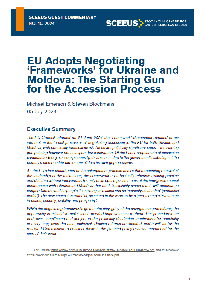 The EU Council adopted on 21 June 2024 the ‘Framework’ documents required to set into motion the formal processes of negotiating accession to the EU for both Ukraine and Moldova, with practically identical texts[1]. These are politically significant steps – the starting gun pointing however not to a sprint but a marathon. Of the East European trio of accession candidates Georgia is conspicuous by its absence, due to the government’s sabotage of the country’s membership bid to consolidate its own grip on power.