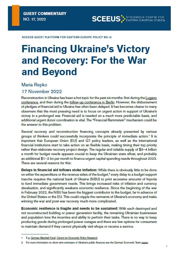 Financing Ukraine’s immediate recovery needs is also an urgent matter and this sense of urgency should not be lost behind donor competition or complicated and time-consuming designs. This is the second layer of urgent need after weapons and basic budget support.