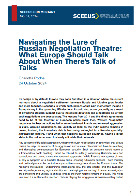 The real near-term risk is instead becoming ensnared in Russian ”negotiation theatre,” much like what happened in Georgia in 2008 and during the Minsk process from 2014 onwards. This would occur at the worst possible moment for Ukraine (and consequently for European security) - a time when doubt over continued Western support is growing. Instead of negotiating from a position of strength, Ukraine would be negotiating from a position of weakness.