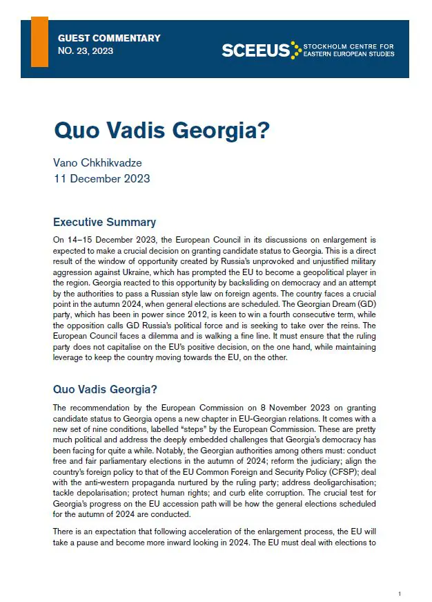 On 14–15 December 2023, the European Council in its discussions on enlargement is expected to make a crucial decision on granting candidate status to Georgia. This is a direct result of the window of opportunity created by Russia’s unprovoked and unjustified military aggression against Ukraine, which has prompted the EU to become a geopolitical player in the region. Georgia reacted to this opportunity by backsliding on democracy and an attempt by the authorities to pass a Russian style law on foreign agents. The country faces a crucial point in the autumn 2024, when general elections are scheduled. The Georgian Dream (GD) party, which has been in power since 2012, is keen to win a fourth consecutive term, while the opposition calls GD Russia’s political force and is seeking to take over the reins. The European Council faces a dilemma and is walking a fine line. It must ensure that the ruling party does not capitalise on the EU’s positive decision, on the one hand, while maintaining leverage to keep the country moving towards the EU, on the other.