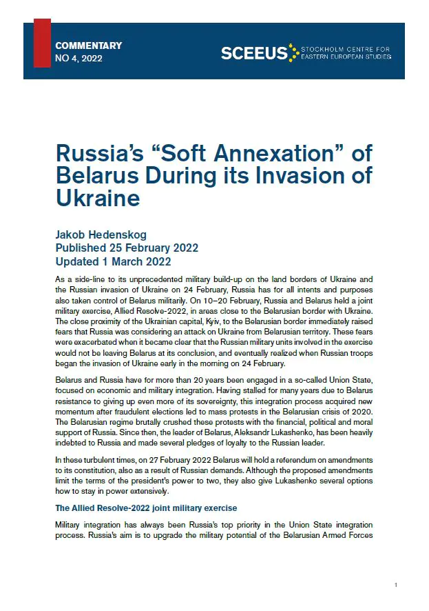 [1] Hedenskog, Jakob (2020) Endgame Belarus: Union State Integration Under Pressure. FOI: Stockholm.