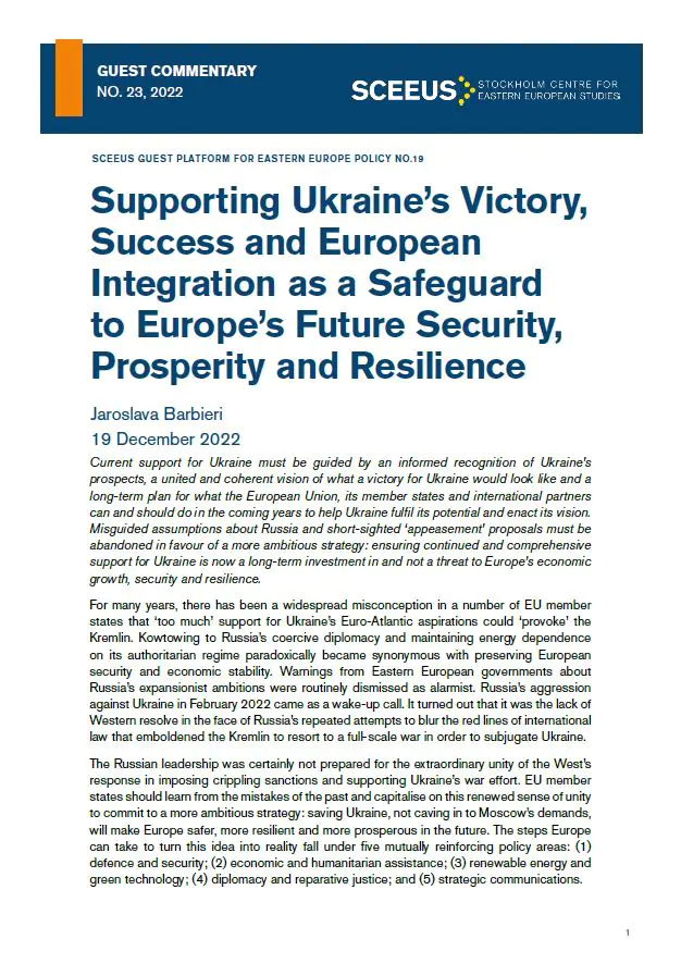 Current support for Ukraine must be guided by an informed recognition of Ukraine’s prospects, a united and coherent vision of what a victory for Ukraine would look like and a long-term plan for what the European Union, its member states and international partners can and should do in the coming years to help Ukraine fulfil its potential and enact its vision. Misguided assumptions about Russia and short-sighted ‘appeasement’ proposals must be abandoned in favour of a more ambitious strategy: ensuring continued and comprehensive support for Ukraine is now a long-term investment in and not a threat to Europe’s economic growth, security and resilience.