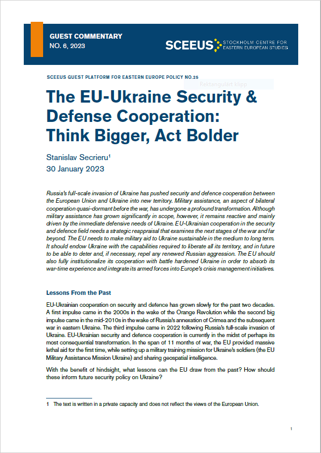 EU-Ukrainian cooperation on security and defence has grown slowly for the past two decades. A first impulse came in the 2000s in the wake of the Orange Revolution while the second big impulse came in the mid-2010s in the wake of Russia’s annexation of Crimea and the subsequent war in eastern Ukraine. The third impulse came in 2022 following Russia’s full-scale invasion of Ukraine. EU-Ukrainian security and defence cooperation is currently in the midst of perhaps its most consequential transformation. In the span of 11 months of war, the EU provided massive lethal aid for the first time, while setting up a military training mission for Ukraine’s soldiers (the EU Military Assistance Mission Ukraine) and sharing geospatial intelligence.