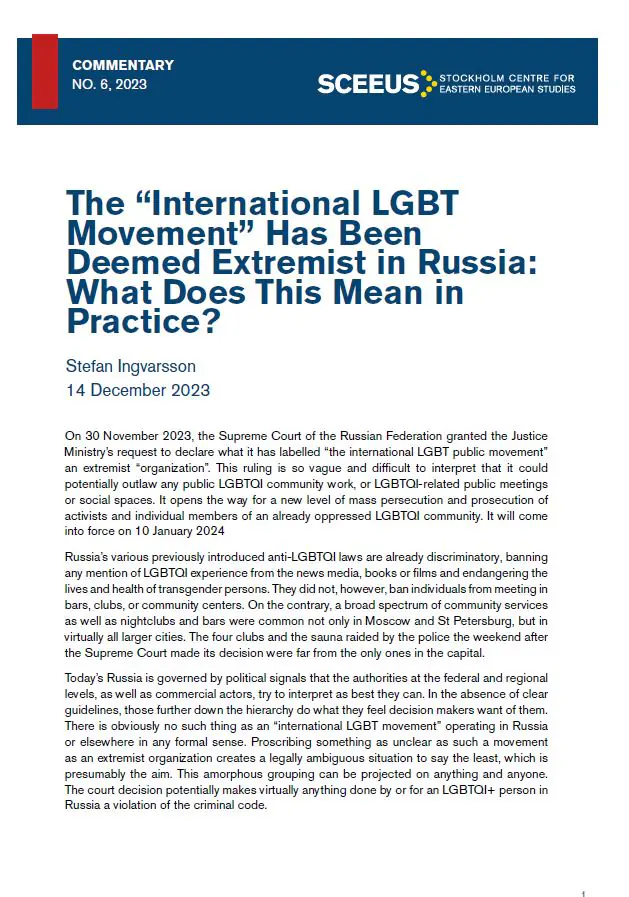Today's Russia is governed by political signals that the authorities at the federal and regional levels, as well as commercial actors, try to interpret as best they can. In the absence of clear guidelines, those further down the hierarchy do what they feel decision makers want of them. There is obviously no such thing as an “international LGBT movement” operating in Russia or elsewhere in any formal sense. Proscribing something as unclear as such a movement as an extremist organization creates a legally ambiguous situation to say the least, which is presumably the aim. This amorphous grouping can be projected on anything and anyone. The court decision potentially makes virtually anything done by or for an LGBTQI+ person in Russia a violation of the criminal code.