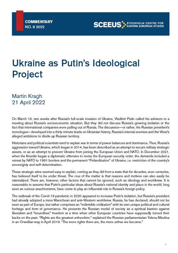 Historians and political scientists tend to explain war in terms of power balances and dominance. Thus, Russia’s aggression toward Ukraine, which began in 2014, has been described as an attempt to secure military strategic assets, or as an attempt to prevent Ukraine from joining the European Union and NATO. In December 2021, when the Kremlin began a diplomatic offensive to revise the European security order, the demands included a retreat by NATO to 1991 borders and the permanent “Finlandization” of Ukraine, i.e. restriction of the country’s sovereignty and self-determination.