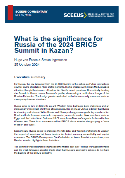 Nevertheless, it will still challenge and compete with other formats, such as the G7. Thereby it provides a diplomatic and political boost to Moscow by placing Russia firmly within a large and influential global grouping, albeit as a sidekick to China. However, as indicated in the joint declaration, Russia has not gained the international support it seeks for its war or its anti-Western agenda. Ultimately, despite Moscow’s close anti-Western alignment with Beijing and the open backing from Iran, within the BRICS format, Russia has so far little support for its aggressive policies, and limited opportunities to further many of its broader strategic aims.